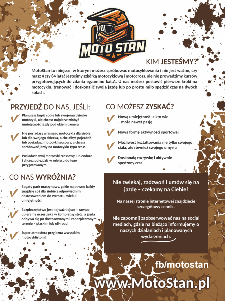 Wiele osób zadaje całą masę pytań – czym MotoStan tak na prawdę się zajmuje? Przede wszystkim zależy nam na rozwijaniu pasji do szeroko pojętego motocyklowania wśród dzieci i młodzieży. Stworzyliśmy miejsce, gdzie dziecko może spróbować swoich sił na motocyklu i jedyne czego potrzebuje to chęci oraz uszczknięcia nieco ze skarbonki 😉