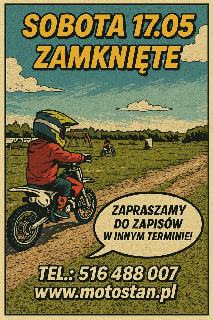 W najbliższą sobotę tj. 17.05.2025r. nie pracujemy na naszym torze. Zapraszamy do zapisów w inne dni. Jesteśmy dostępni dla Was również w tygodniu. Nie czekajcie, zacznijcie swoją przygodę z MotoStanem.