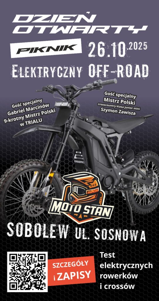 Jesień to koniec sezonu dla jednośladów…. ale nie dla crossów! Zapraszamy na imprezę offroadową zawierającą prezentację crossów elektrycznych dla dzieci i dorosłych, szkolenia z jazdy dla dzieci i dorosłych, a także jazdy testowe na torze, rywalizację oraz konkursy.